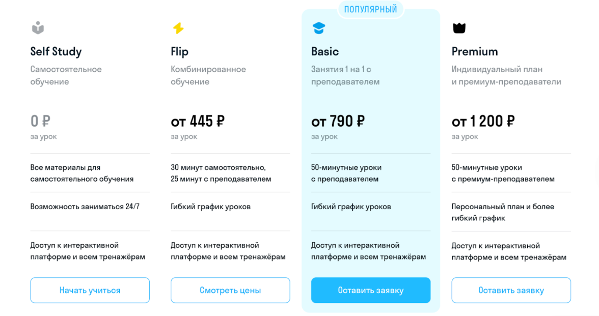Пример. Сервис обучения английскому языку предлагает варианты уроков: от бесплатного до премиум. Бесплатные самостоятельные занятия стандартизированы, поэтому здесь кнопка действия — «Начать учиться». Варианты базового и премиального обучения без фиксированной цены, поэтому CTA меняется на «Оставить заявку», чтобы менеджер перезвонил и уточнил детали.