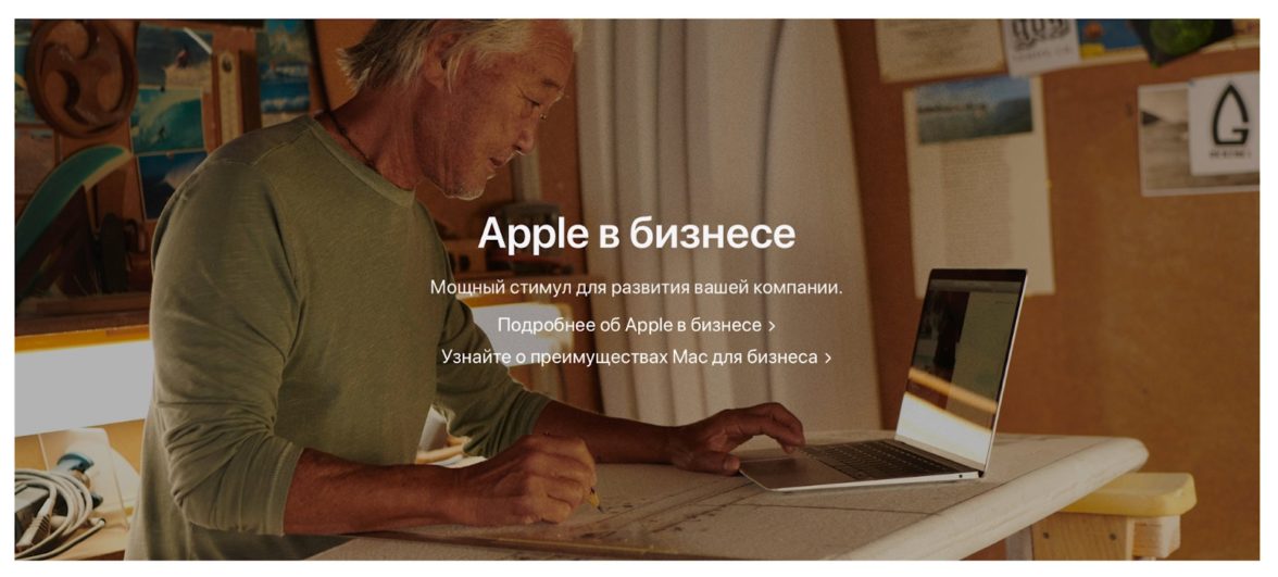 Apple предлагает два CTA подряд под разные запросы. Призывы к действию здесь не в виде кнопки и длиннее стандартных в одно-два слова, но выполняют свою функцию.