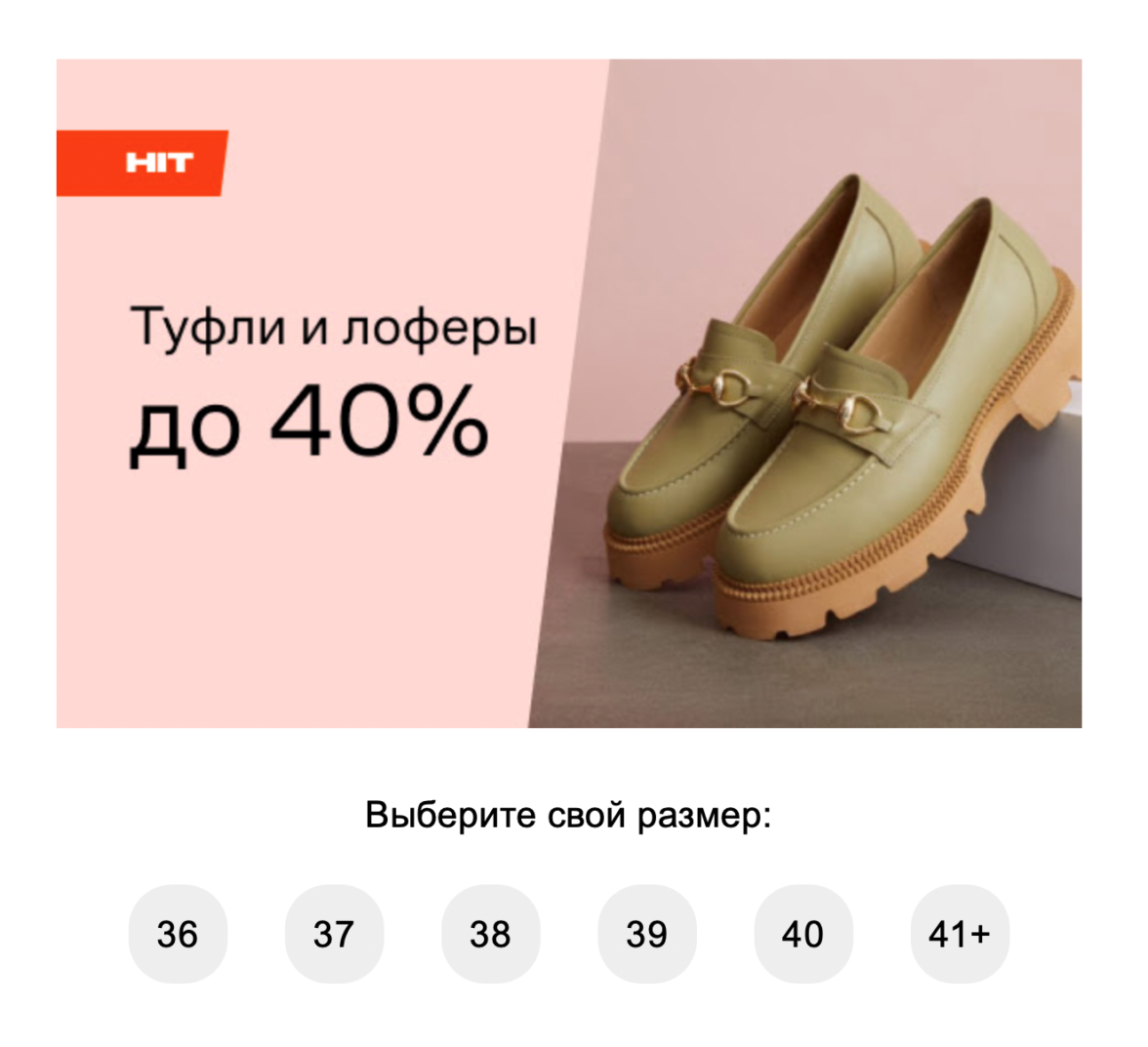 Вариант, где кнопки CTA как бы нет, но побуждение к покупке есть. Маркетплейс предлагает выбрать размер модели обуви и сразу перейти к покупке.