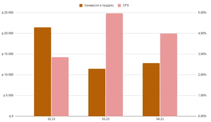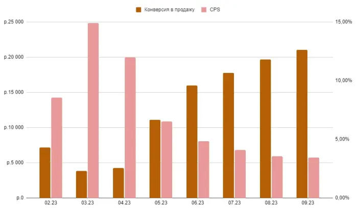 Увеличение стоимости лида за счёт покупки более дорогого трафика дало свои плоды: более качественный трафик показал более высокий показатель конверсии в покупку.