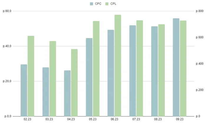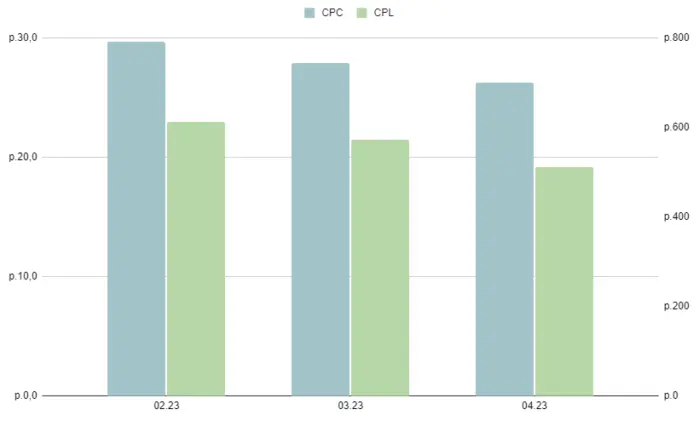 Из-за привлечения более дешёвого трафика, снизилась стоимость клика и снизилась стоимость лида: