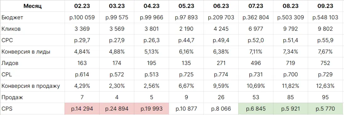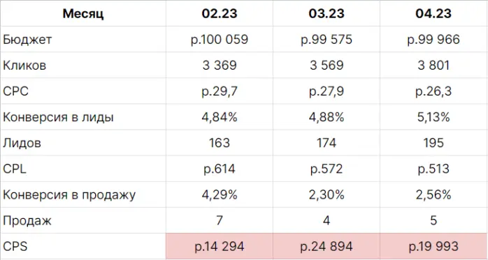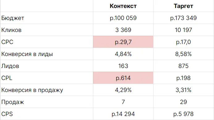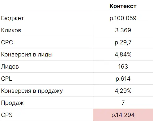 Высокая стоимость лида и ещё более высокая стоимость продажи: платить за купившего клиента больше 14 294 рубля при среднем чеке 19 900 рублей заказчику явно не хотелось.