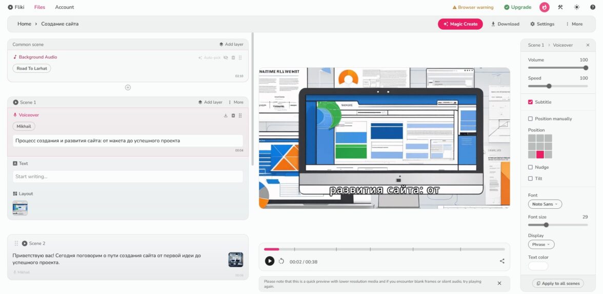 Выбираем нужный формат, язык и просим ИИ Fliki создать видео на тему «Процесс создания и развития сайта: от макета до успешного проекта», указав основные этапы: разработка, продвижение, поддержка. Так как в приоритете — мультяшность, а в образцах — в основном примеры съемок из жизни, видеоряд доверили сгенерировать ИИ. В результате получилось это: