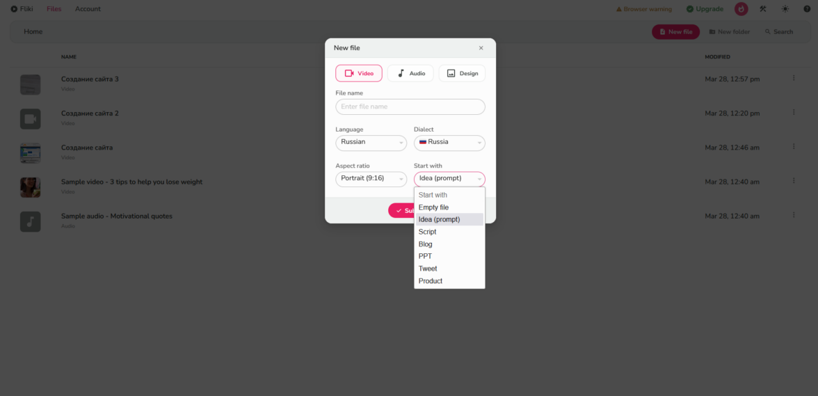Сразу после регистрации (можно войти через Google) на Fliki предоставляются два образца-черновика: видео и аудио. Личный кабинет прост и лаконичен