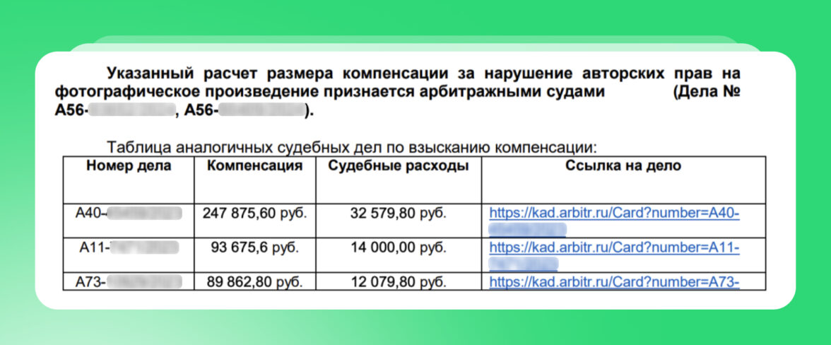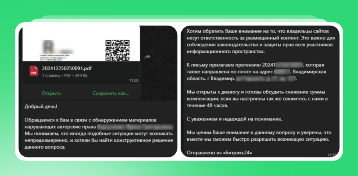 Но на деле – это самая настоящая схема по взысканию компенсаций. Выбор у бизнеса невелик: если письмо упало вам в ящик, то вы ограничены временными рамками. У нашего клиента было 48 часов на отпор. Либо платите по «скидке» из письма, либо идёте на судебный процесс.