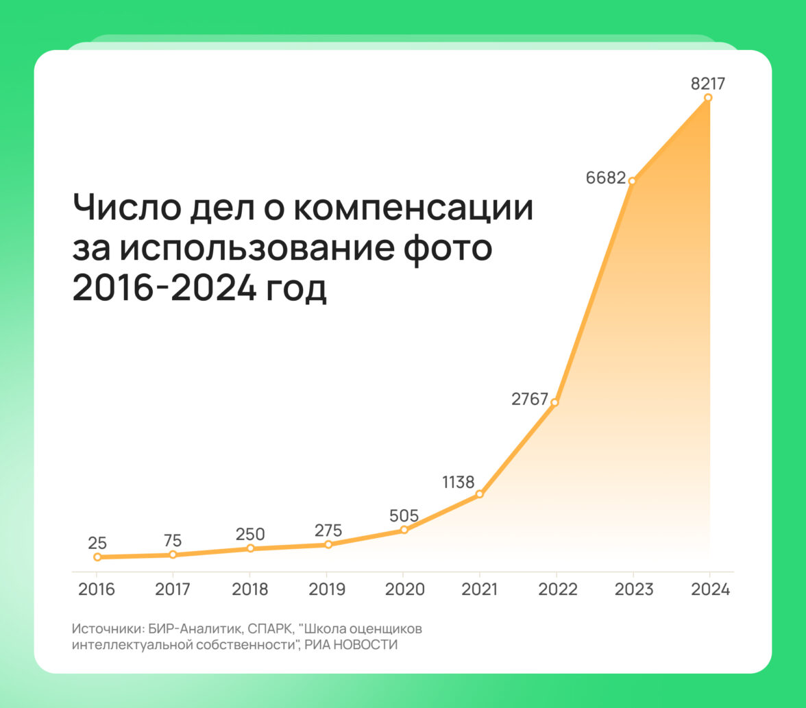 В таких случаях за авторскими притязаниями стоит не конкретный фотограф, а целый штат юристов. Согласно расследованию РИА Новости, количество подобных исков выросло со считанных единиц в 2015 году до нескольких тысяч дел в 2024 году. А оборот этого рынка – больше 1,5 млрд рублей.
