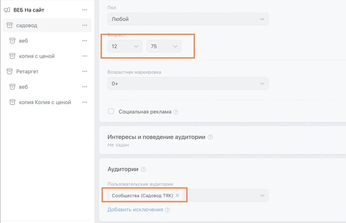 Кроме того, агентство недостаточно грамотно использовало возможности самой платформы. Например, соцсеть ВКонтакте позволяет привлекать пользователей, основываясь на подписках определенных сообществ. Однако из множества тематических площадок, потенциально интересных продавцам на маркетплейсах, был выделен лишь один паблик под названием «Садовод» с аудиторией около 13 тыс. подписчиков. Хотя теоретически среди участников могли находиться потенциальные покупатели, логика и статистический анализ однозначно свидетельствовали, что эта группа не соответствует портрету целевой аудитории клиента.