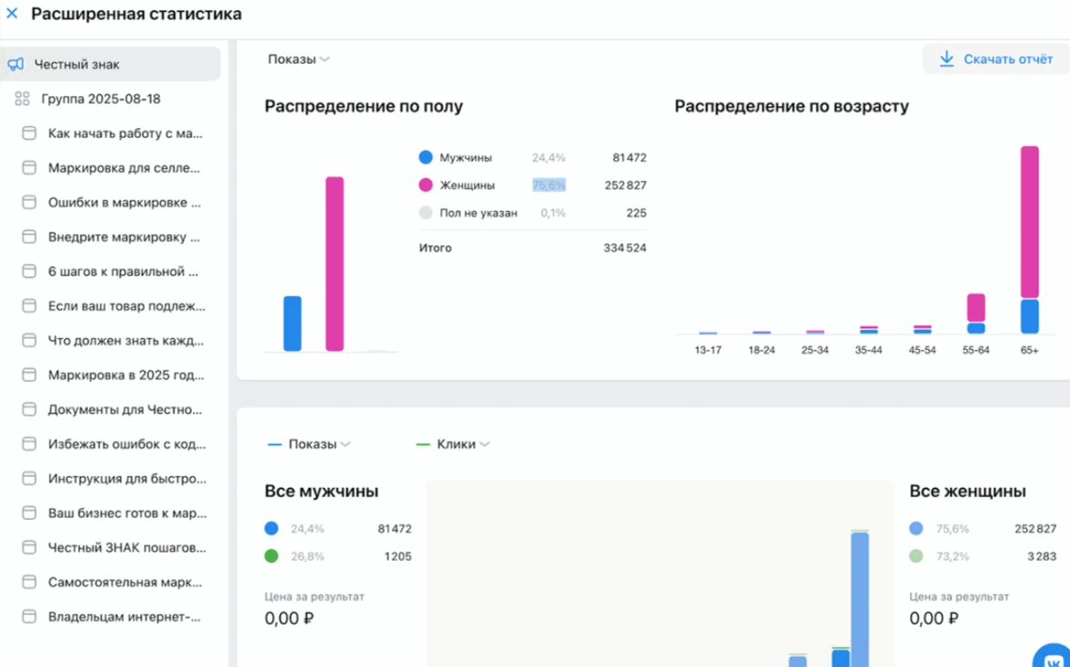 При анализе выяснилось полное отсутствие сегментации аудитории, а выбранные интересы никак не отражали реальную целевую группу. Агентство рапортовало о минимальных ценах за переходы и высоком количестве заявок, хотя фактически большинство потенциальных покупателей оказывались нерелевантными. Фактически предложение ориентировалось на широкую аудиторию, исключая именно тех, кому необходим специализированный сервис для взаимодействия с платформой «Честный знак».