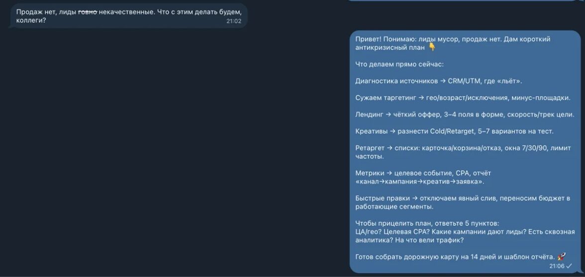 Что мы протестировали за последние 2 месяца и какие сделали выводы? Маркетинг — это постоянные эксперименты. Слабый подрядчик может их вообще не проводить. Если на этот вопрос нет внятного ответа о новых креативах, сегментах, гипотезах и их результатах — значит, работа над улучшением не ведется.