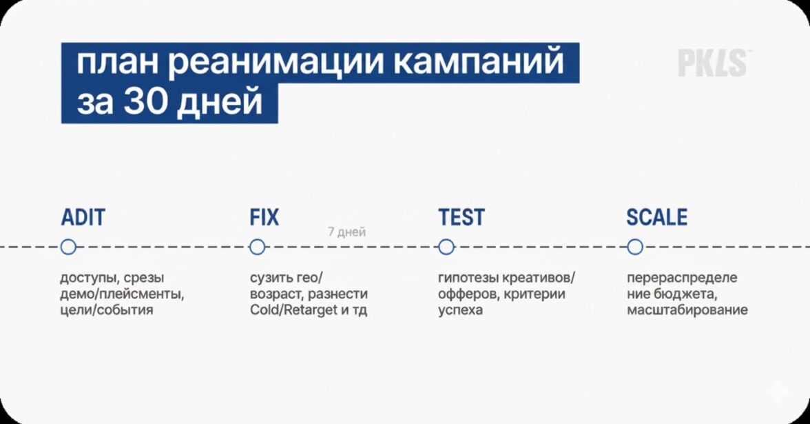 Понять, что реклама сливает бюджет — лишь половина дела. Второй шаг — исправить ситуацию. Аудит рекламных кампаний выявляет все проблемные точки: цели, ставки, аудиторию, креативы, посадочные страницы.