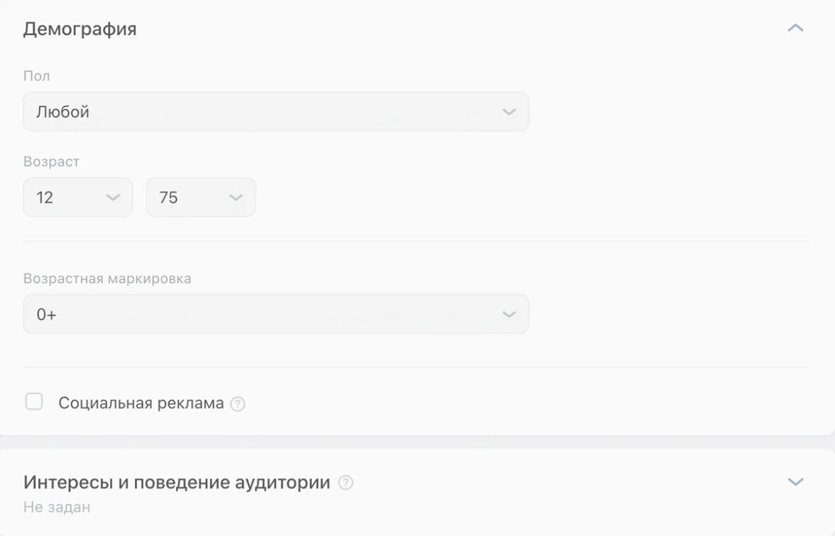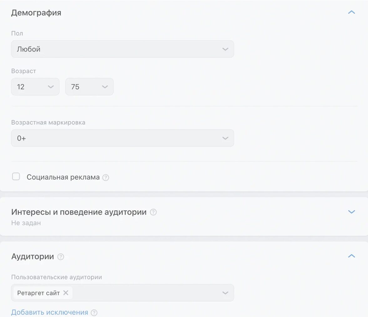 Первым делом мы обратили внимание на некорректный выбор аудитории. Таргетинг оказался чересчур широким: кампания охватывала всю территорию России, а возраст целевой группы варьировался от 12 до 75 лет.