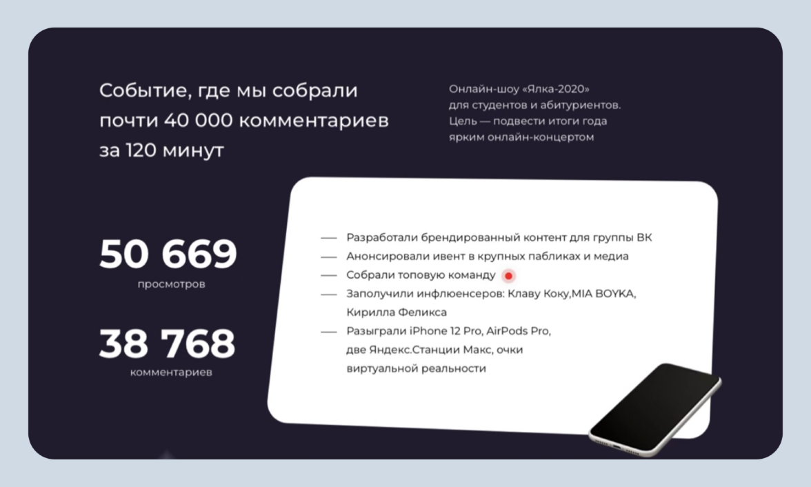 Внимание сконтентрировалось на цифрах. Их сделали большими, привлекающими внимание. Этим показан масштаб результатов компании. Описание каждого кейса спрятано в кнопках. Всё-таки, заказчик в первую очередь хочет видеть итог. А если заинтересуется процессом, то сделает дополнительный клик.