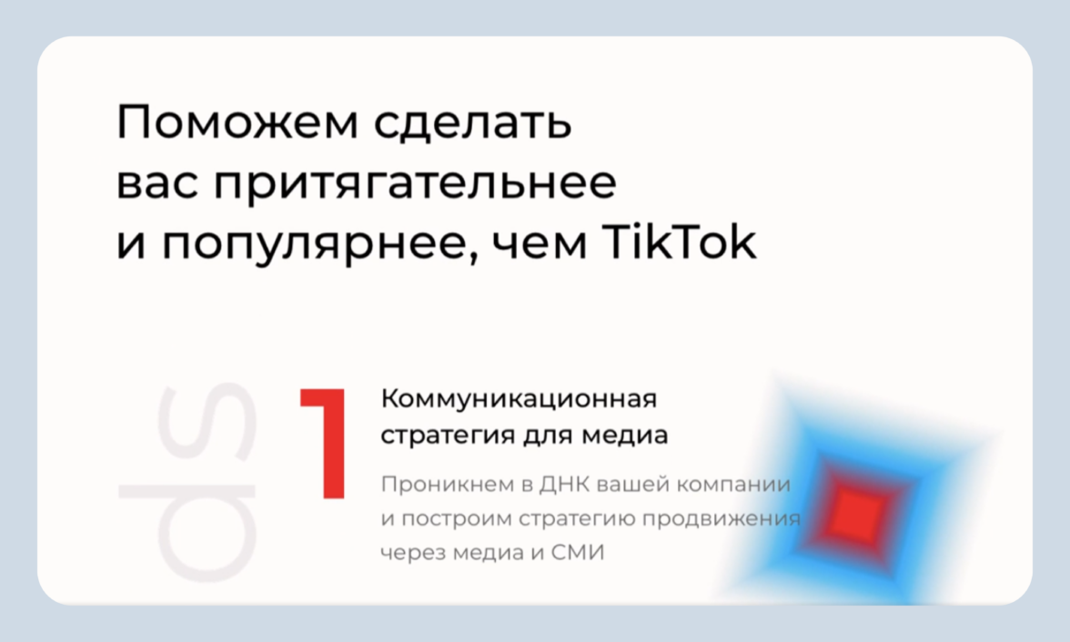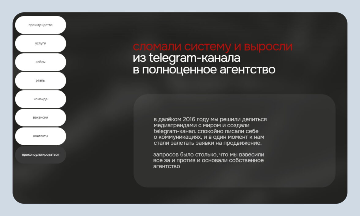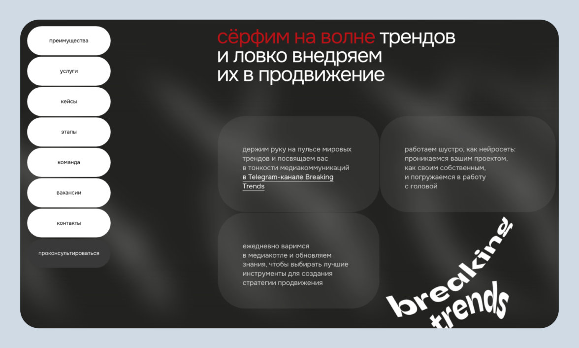Добавился блок с рассказом о компании: как телеграм-канал вырос в полноценное агентство. Это фишка ребят. Обычно SMM-студии регистрируются, выходят на рынок, и только потом начинают вести соцсети. А у Breaking Trends получилось наоборот. Хотели делится трендами с подписчиками, но начали прилетать заявки на продвижение. Тогда и появилось агентство.