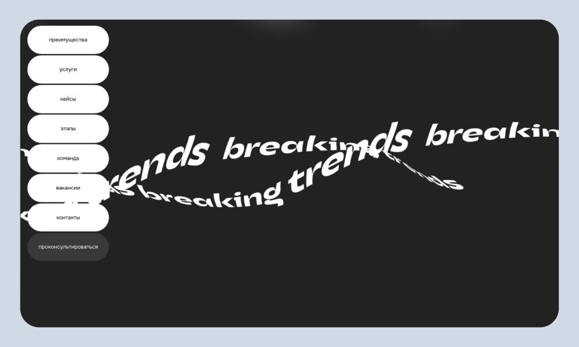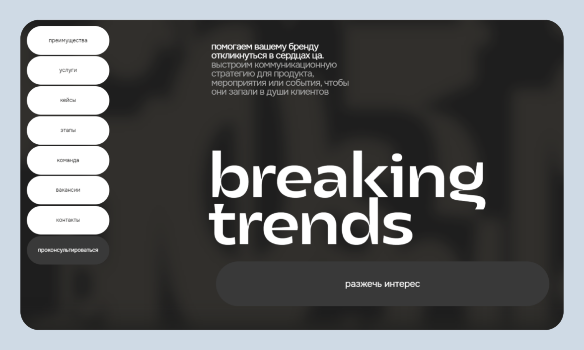 Лендинг пронизан айдентикой компании. В каждом блоке используется их название — Breaking Trends. В анимации, на фоне и в небольших элементах. Так передалась «вездесущность» ребят. Всё-таки они работают по многим каналам, варятся во всех трендах и громко о себе заявляют.