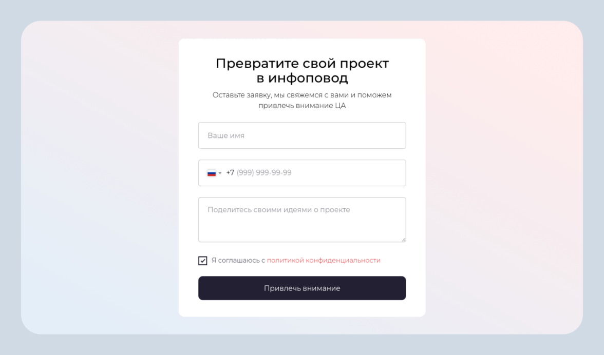 На первом блоке была часть коллажа с голосовым сообщением. На неё много кто кликал, так как думал, что элемент интерактивный. Это распыляло внимание пользователя и отвлекало от кнопки с формой захвата.Форму могли реже заполнять из-за последней строки, которая была обязательной. Всё-таки людям проще позвонить и рассказать о проекте, чем тратить время на расписывание целей и задач в текстовом поле.
