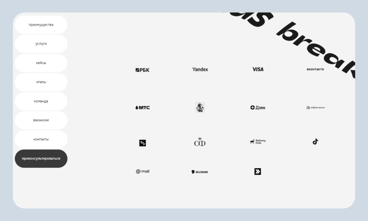 В свежем брифе появились громкие бренды, которые знают все — Breaking Trends. Яндекс, Visa, РБК. Поэтому они разместились сразу после первого экрана, чтобы показать масштабность и крутизну агентства. И только потом — блок с преимуществами, потому что для конечного потребителя важна статусность компании.