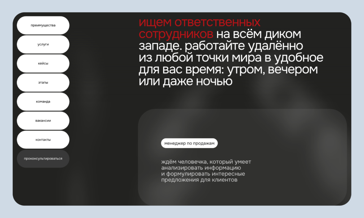 Старый сайт «подгонял» агентству новых сотрудников, хотя там не было ничего для соискателей. И раз компания создала такой фурор среди специалистов, добавился блок с вакансиями. Теперь не нужно «стучаться в личку», чтобы стать частью команды. Достаточно кликнуть на кнопку и заполнить форму.