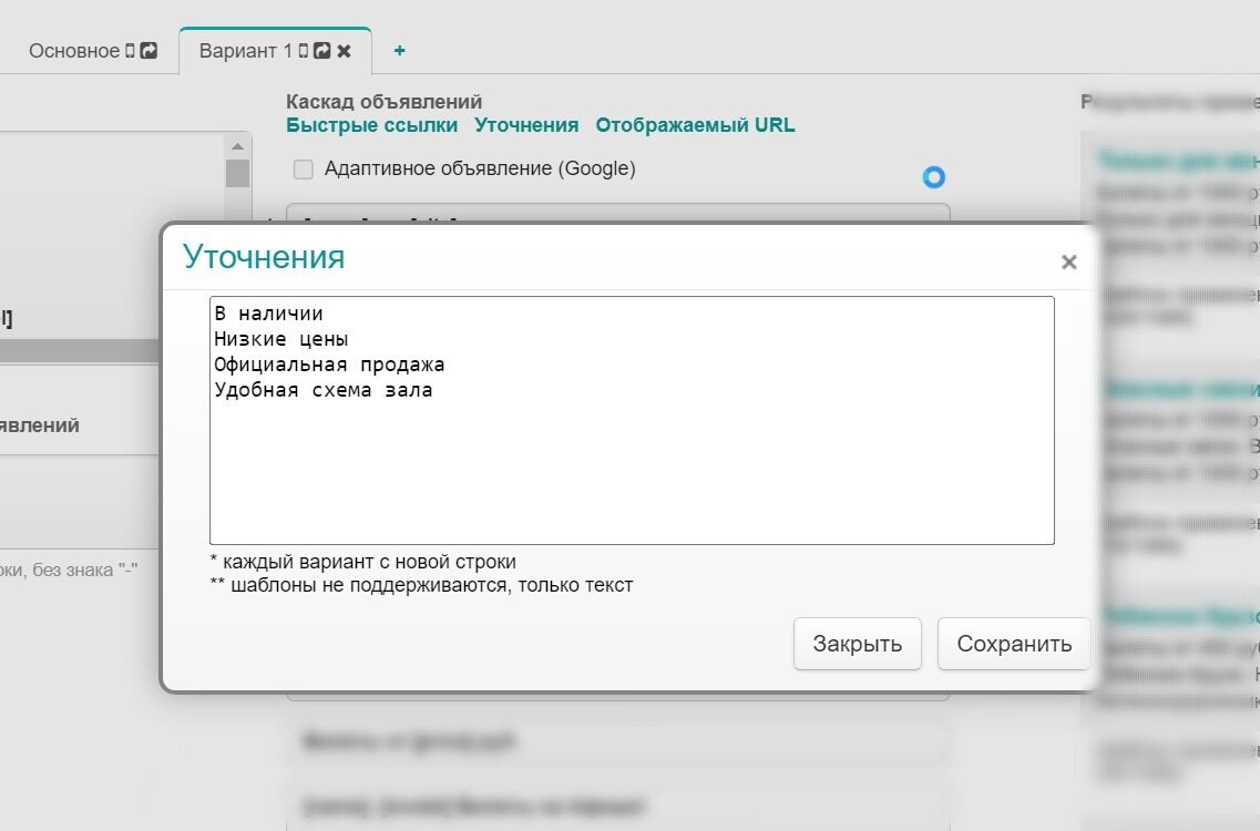 Тогда мы попробовали несколько сторонних платформ. Большинство из них также генерировали скудную семантику или подставляли ключевые фразы по шаблону в заголовок. Тексты объявлений из-за этого получались очень сырые.