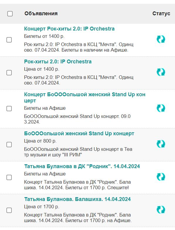 Концерты — используем в заголовках и тексте объявления теги: площадка, город, артист, цена, плюс тип мероприятия и продающие общие фразы. Самое важное — имя исполнителя, дата концерта.