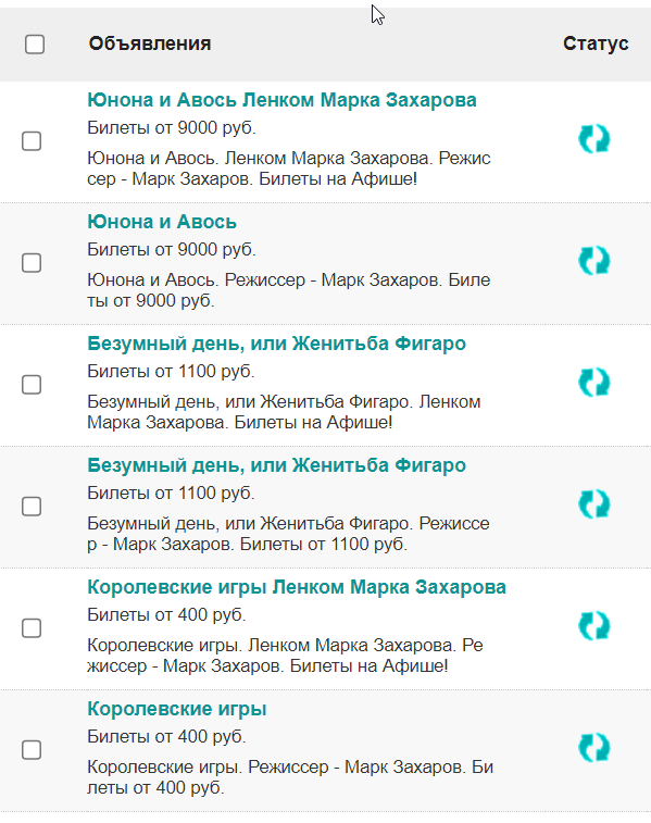 Шаблон объявления (заголовок + тело объявления) получается из сочетания тегов из фида и продающих фраз. При генерации объявления вместо тегов подставляется их содержание из фида. Например, тег [city] — название любого города, [actor] — имя артиста. Перед тем как использовать генератор, мы создали два основных шаблона под каждое направление: