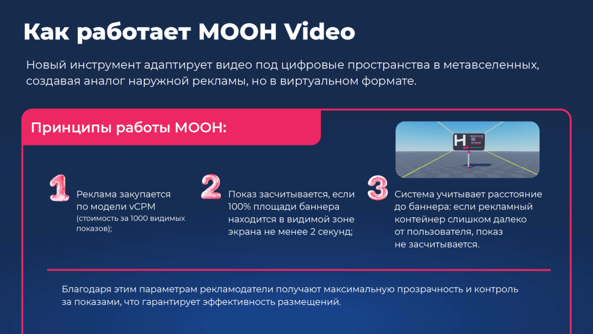 MOOH (Metaverse Out-of-Home) — собственная разработка Hybrid Metaverse, созданная для размещения рекламы внутри виртуальных пространств. Новый формат Video Native расширяет эту концепцию, превращая видеоролики брендов в естественный элемент игрового окружения.