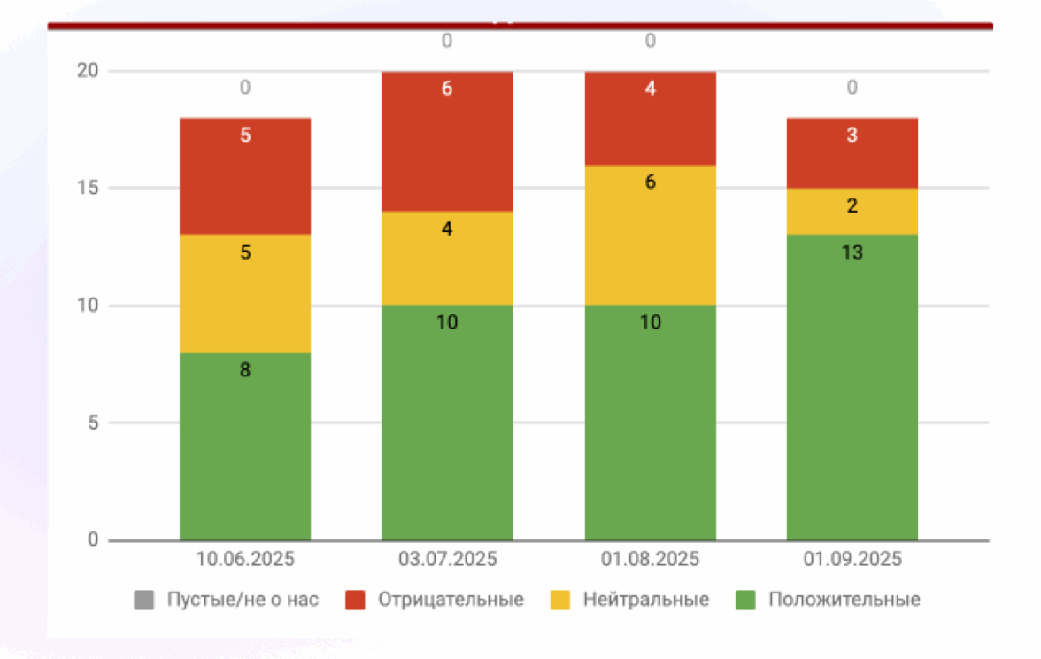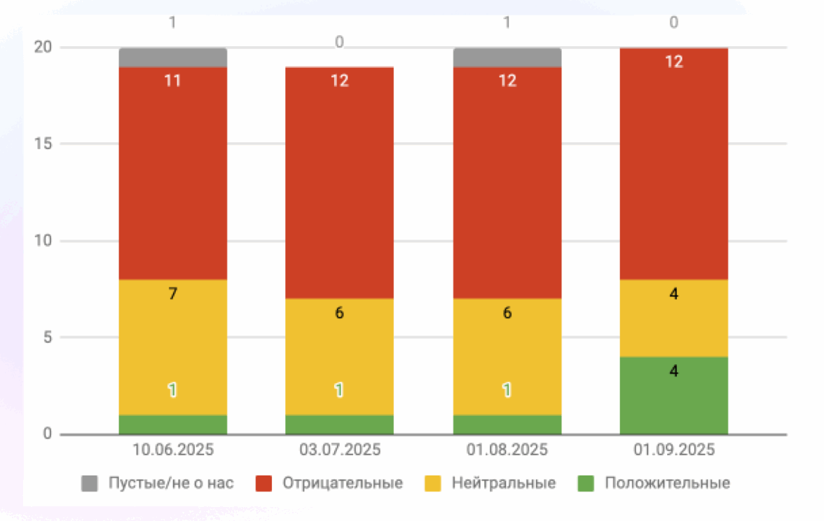 Для этого мы расширили зону контроля: если раньше компания смотрела максимум 2–3 ключевых фразы, то мы проанализировали топ-20 результатов сразу по 10 запросам. Это позволило увидеть реальную картину: на каких площадках формируется первое впечатление и какие темы чаще всего всплывают в выдаче.