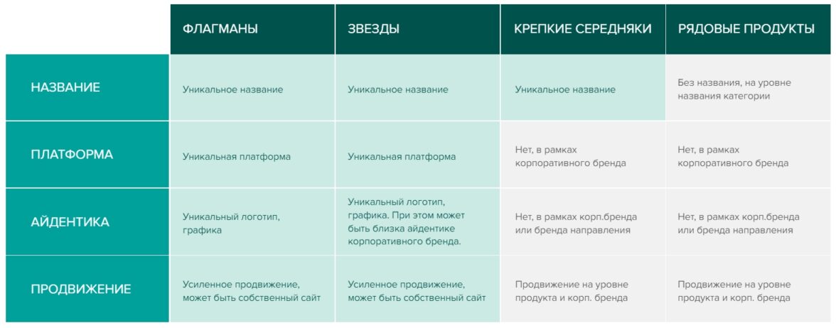 На уровне продуктов мы распределили весь ассортимент на 4 категории, для каждой из которых сформулировали свои правила брендирования. Это позволило нивелировать разнородность портфеля, усилить позиции лидеров и вывести из тени менее известные, но перспективные товары.