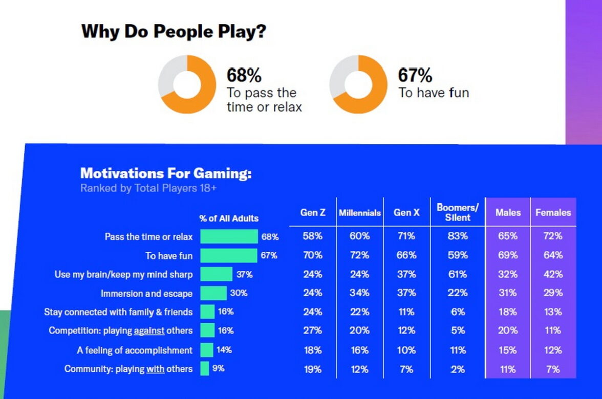 Выяснилось, что две главные причины звучат так: «провести время или расслабиться» (68%) и «развлечься» (67%). При этом проводят время и расслабляются 83% тех, кому от 60 лет, а развлекаться больше всего любят миллениалы (те, кому от 28 до 43 лет).Остальные варианты мотивации к видеоиграм менее популярны. Какую-то пользу для ума видят в играх 37% играющих.