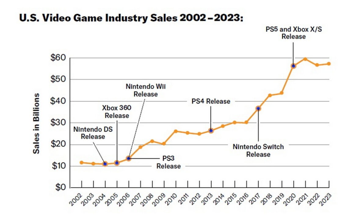 По данным Circana, приведенным в отчете, в 2023 году американские потребители потратили на видеоигры $57,2 млрд, в том числе $48 млрд на контент, $6,6 млрд на устройства для игры и $2,6 млрд на аксессуары. Общий вклад индустрии в ВВП США, по оценке ESA, составил $66 млрд.