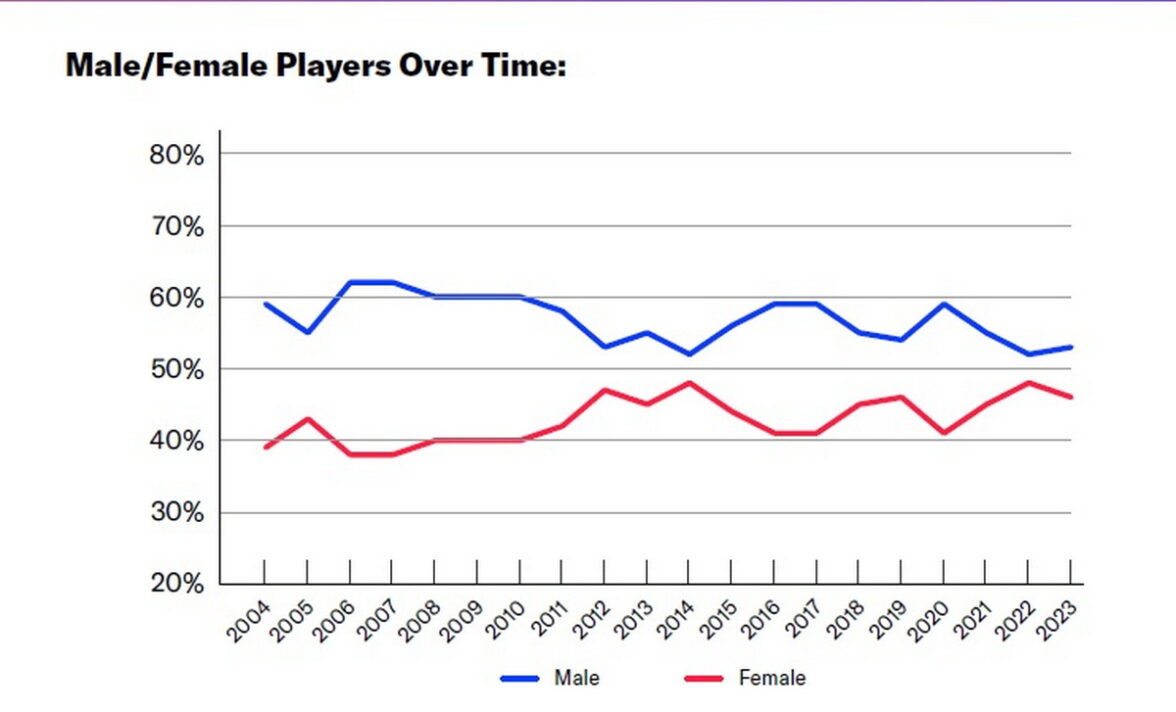 53% играющих — мужского пола. Если в 2006–2007 году более 60% играющих были мужчинами, то в последние годы соотношение женщин и мужчин приближается к пропорции 50:50.