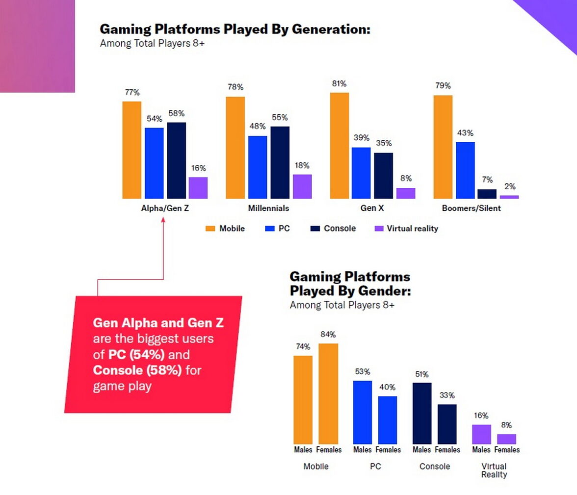 Разница между поколениями отчетливо заметна по тематике наиболее популярных игр. У 56% зумеров и 64% самых маленьких на первом месте стоят аркады. Популярность экшен-игр у представителей этих поколений, соответственно 55% и 60%. У зумеров на третьем месте по популярности шутеры — 54%, у самого младшего поколения — головоломки (56%). Все, кто старше 28 лет, ставят головоломки на первое место. Шутеры у старших поколений не входят в тройку самых популярных жанров.