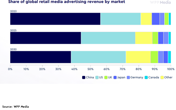 Крупнейшими мировыми рынками, где активнее всего развиваются ритейл-медиа, являются Китай и США, однако их доля будет снижаться по мере развития этого сегмента в других странах, считают аналитики WPP.