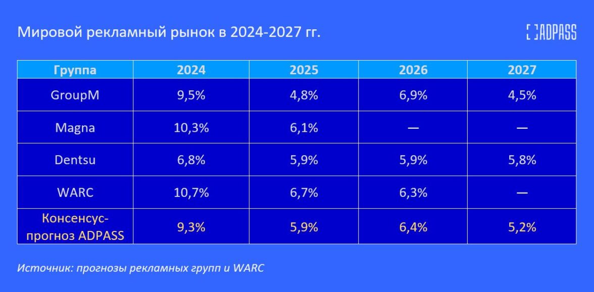 Консенсус-прогноз ADPASS: в 2025 году мировой рекламный рынок снизит динамику на треть, до 5,9%