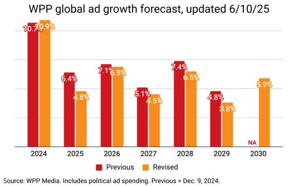 По обновленному прогнозу WPP, в 2025 году объем мирового рекламного рынка составит $1,08 трлн при росте на 6% к показателям 2024 года. В 2026 году WPP прогнозирует рост мирового рекламного рынка на 6,1%. В последующие пять лет вместо среднегодового роста на 6,4%, предсказанного ранее, мировой рынок будет расти лишь на 5,4% в год.