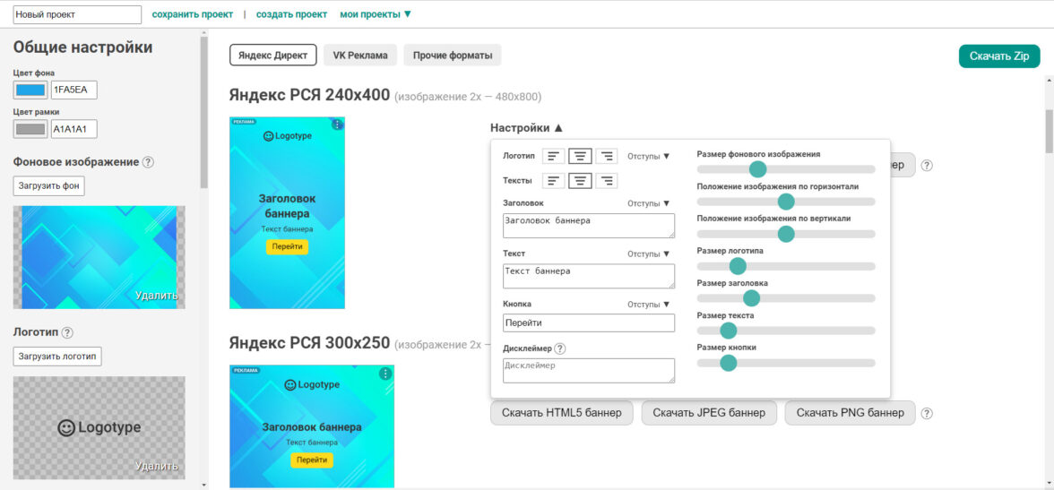 В конструкторе можно сделать анимированные HTML5 и графические баннеры для Яндекс Директа и графические баннеры для остальных площадок.