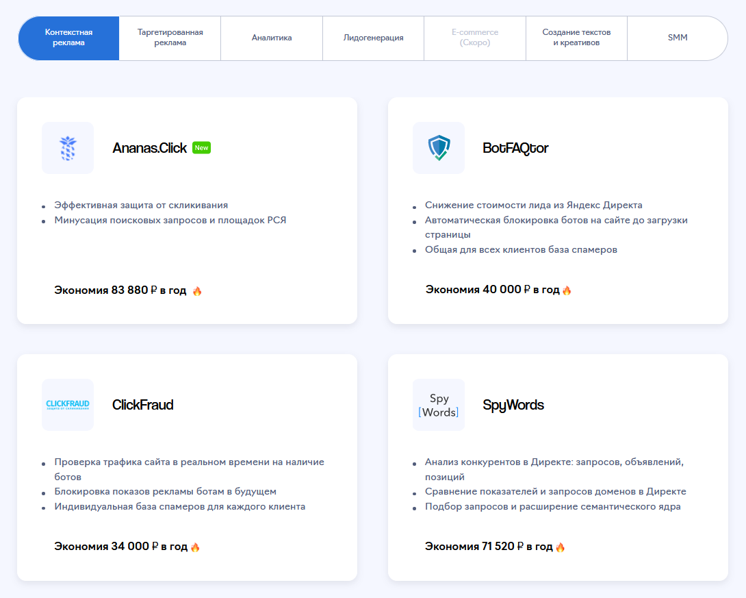 Маркетплейс инструментов eLama предлагает множество полезных решений для повышения эффективности рекламных кампаний, включая инструменты для борьбы со скликиванием, сбора аудиторий для таргетинга, упрощения аналитики и отчетности, и многое другое. Все инструменты доступны бесплатно при достижении минимального порога расходов на рекламу.