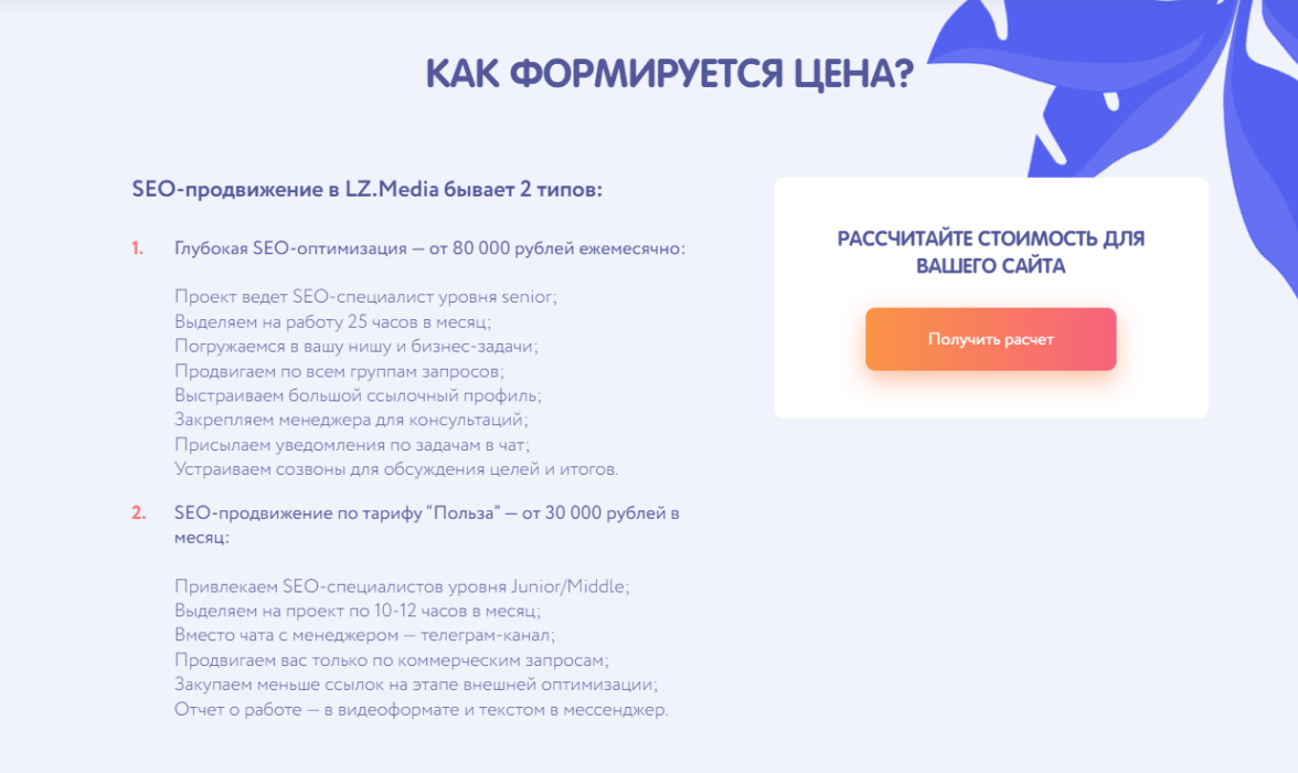 LZ — это бутиковый подход с выделением максимума часов на проект, с привлечением опытных специалистов и дополнительными возможностями для клиента. Например, с ежемесячными созвонами для обсуждения отчетов.