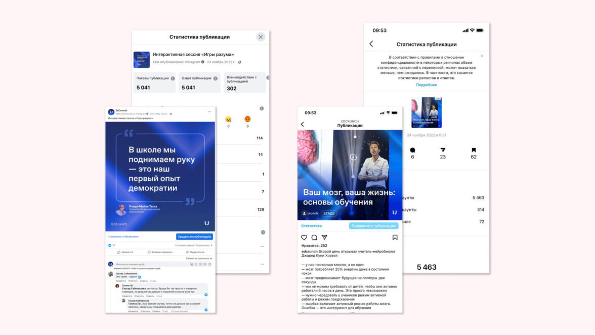 Для таргета мы продумали ролики в TikTok и визуалы для РСЯ и КМС. А чтобы персонализировать рекламные объявления, мы разделили всю аудиторию на сегменты: родители, бизнесмены, учителя и преподаватели, директора и руководители. Дизайнер был со стороны заказчика.