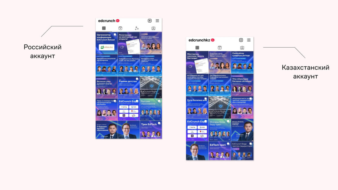 Мы решили не смешивать аудитории и дублировать контент на двух языках в двух аккаунтах. Нашли переводчика и через него переводили контент с русского на казахский.Вот такая получилась лента:
