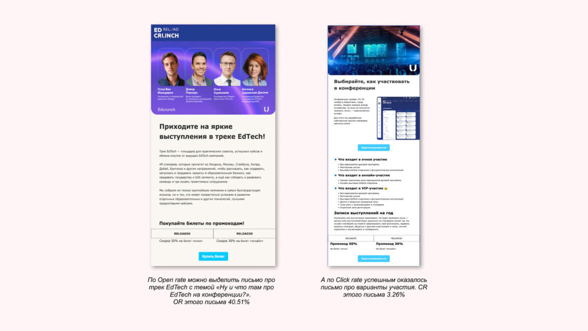С помощью сегментирования мы охватили всю целевую аудиторию. У нас появились идеи о контенте на первое время. А ещё мы создавали видеоинструкции о том, как купить билет и писали посты о технических моментах. Например, как поучаствовать в конференции бесплатно или в чём разница онлайн и офлайн-участия.
