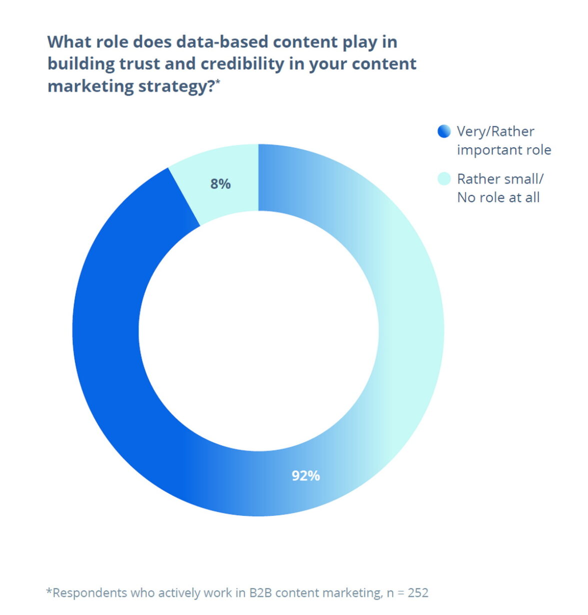 Контент на основе данных играет ключевую роль в формировании доверия: 92% маркетологов считают его важным или скорее важным, тогда как лишь 8% отмечают незначительное или нулевое влияние.