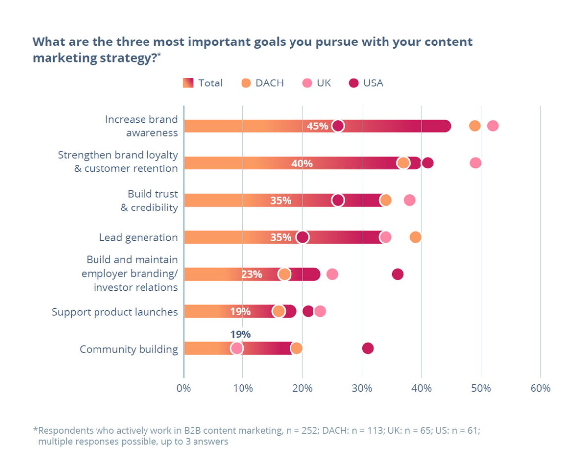 Рост объема контента и фрагментация каналов усиливают конкуренцию за внимание аудитории. На этом фоне компании пересматривают цели контент-маркетинга. Так, 45% респондентов называют приоритетом повышение узнаваемости бренда, 40% — укрепление отношений с клиентами, 35% — формирование доверия и экспертности.