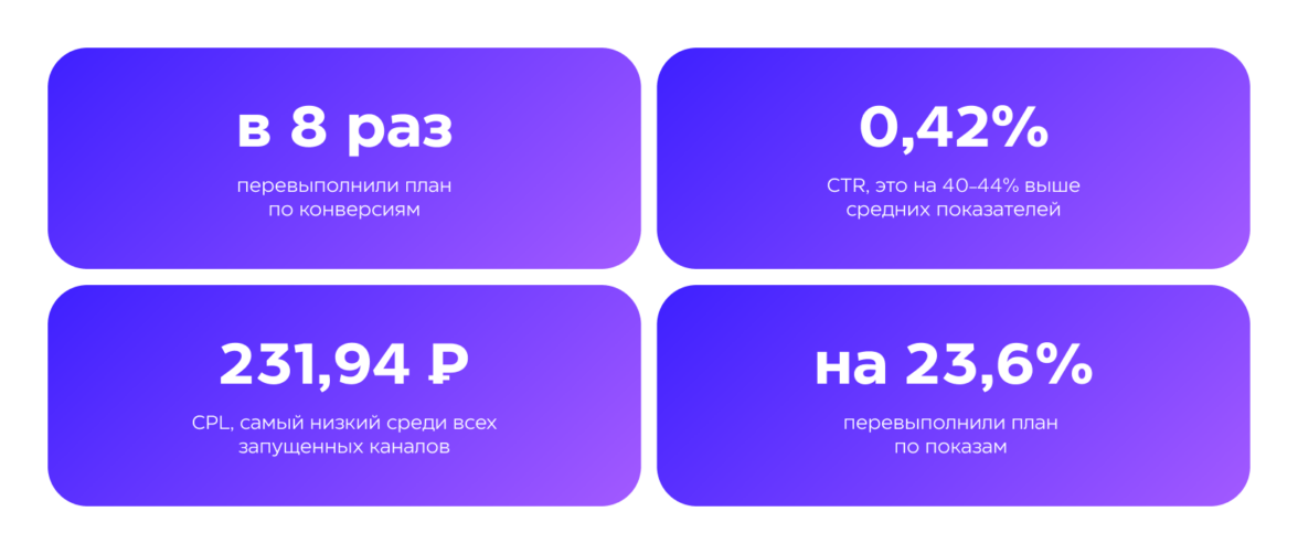 Нас порадовали результаты медийной рекламы на Ozon. Конверсии в виде бесплатных регистраций превысили наши прогнозные значения, также в целом по всем другим каналам показатели с этого размещения были наибольшими. Особенно хорошо показал себя баннер на странице «Заказ выполнен». Мы подтвердили свою гипотезу с прошлых проектов о том, что медийные форматы могут приносить конверсии на уровне перфоманс-каналов.