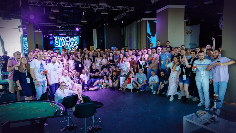 В 2022 году мы второй раз провели корпоратив в формате Evrone Fest. Это значит, что вместо обычной вечеринки мы сделали полноформатное событие с множеством разных активностей. В этот раз мы забрались на самую высокую площадку Москвы — 90-й этаж башни «Федерация».