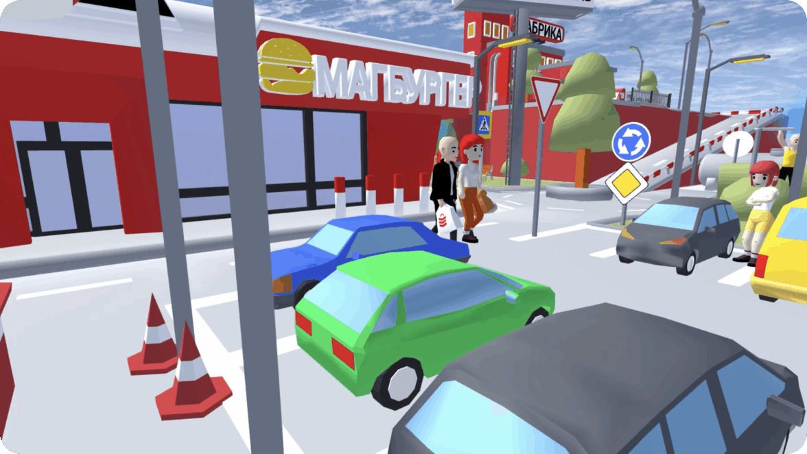Мы отказались от статичной модели. Вместо этого построили динамичный мир, где постоянно что-то происходит. Автомобили движутся по дорогам, люди ходят по улицам, даже птицы летают между зданиями.