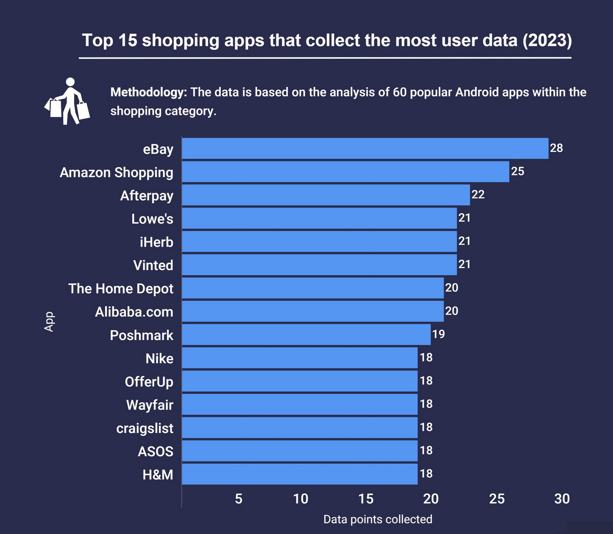 Согласно исследованию, больше всего пользовательских данных собирают приложения eBay и Amazon Shopping. Так, eBay аккумулирует 28 типов различных данных, а Amazon — 25, включая личные, финансовые данные и данные о местоположении.