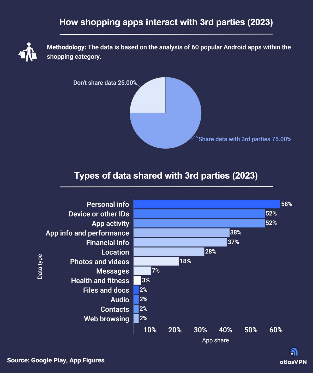 По оценке AtlasVPN, из 60 исследованных приложений 75% передают собранные данные своим партнерам. 58% приложений передают третьим лицам личную информацию о пользователе, а 52% – идентификаторы устройства или другие уникальные идентификаторы, например, уникальный номер мобильного устройства IMEI. Вся эта информация может быть затем использована в маркетинговых целях, например, для таргетированного показа рекламы.