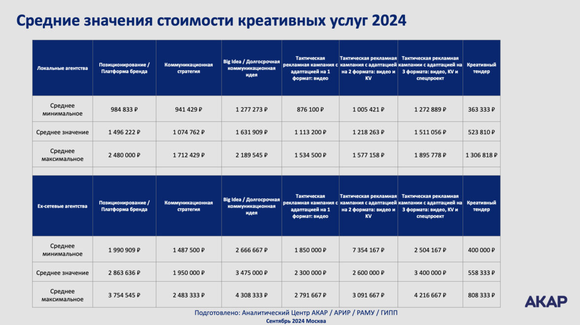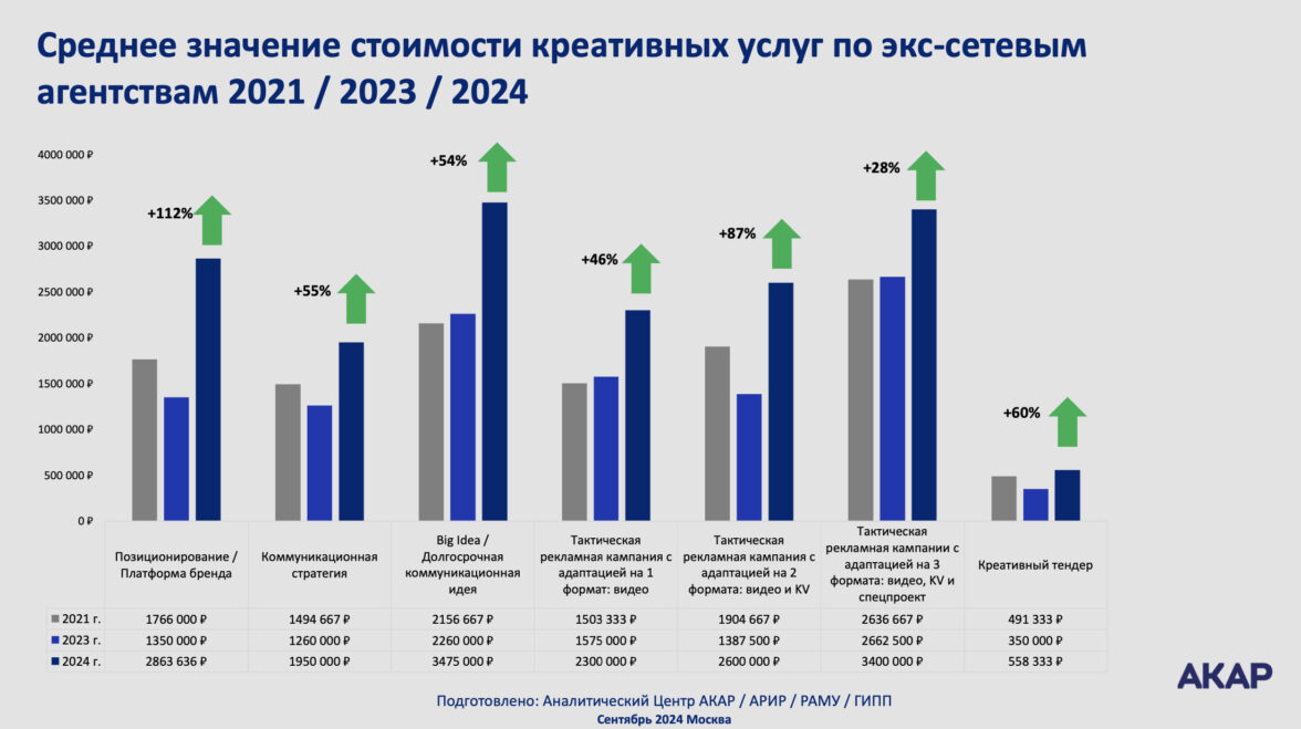 Ассоциация коммуникационных агентств России (АКАР) выпустила очередное исследование стоимости услуг ведущих российских креативных агентств — как входивших до 2022 года в крупные мировые сети, так и отечественных. Средние цифры по рынку показывают: сфера креатива процветает, уверенно повышая цены в пределах 2-3 размеров годовой инфляции, а на некоторые услуги — на десятки процентов. Более чем на 20% подорожали по рынку в целом разработка позиционирования (платформы) бренда (+41% по сравнению с осенью 2023 года) и проведение креативного тендера (+89%).