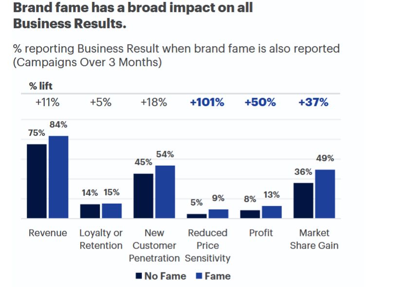 Традиционные бренд-метрики — осведомленность, доверие или имидж бренда, редко влияют на прибыль, выручку или рост доли рынка, утверждают в Effie и System1. Самой эффективной метрикой в этом отношении является более редкая «известность» (brand fame) — широкое признание и установившееся восприятие бренда среди общественности или в определенной нише.