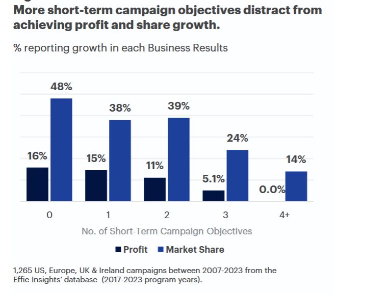 Краткосрочные же результаты, на которые ориентирован перформанс-маркетинг, в итоге не приводят к росту прибыли. Авторы отчета пришли к парадоксальным выводам: проанализировав 1,3 тыс. работ, поданных на Effie за 15 лет, они обнаружили, что по мере роста количества краткосрочных метрик (клики, трафик, лайки, подписчики и пр.), которые в своих заявках на премию перечисляли рекламодатели, эти компании все реже говорили о росте прибыли. Так, 15% рекламодателей, сообщавших о росте какой-либо одной краткосрочной метрики (например, кликов), также писали о росте прибыли. У тех, кто заявлял о росте двух метрик (например, кликов и подписчиков), упоминания о росте прибыли снижалась до 11% случаев. Наконец, ни один рекламодатель, бодро рапортовавший о росте четырех и более метрик, просто не вспоминал об увеличении прибыли.